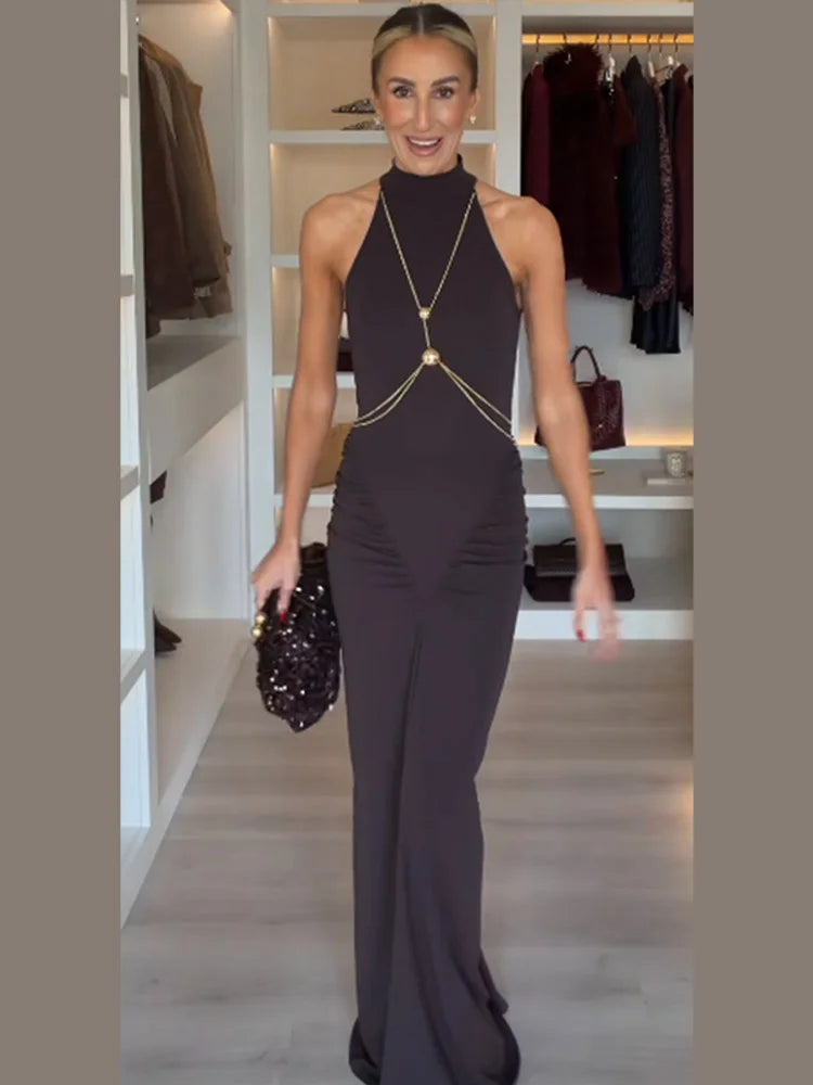Elevate your evening look with the sophisticated metal chain detail, thoughtfully placed to create a striking visual contrast.