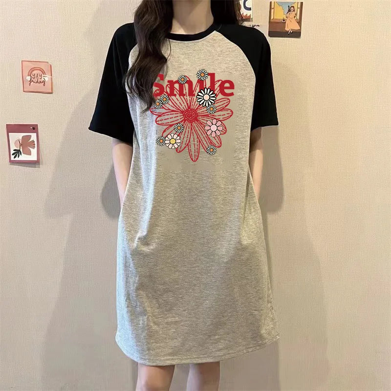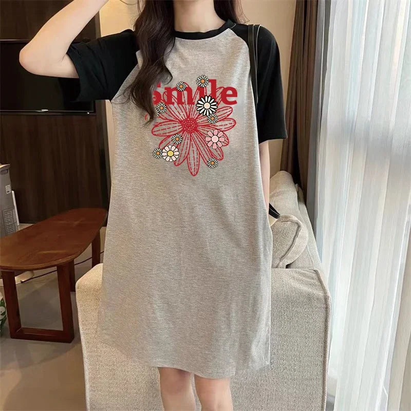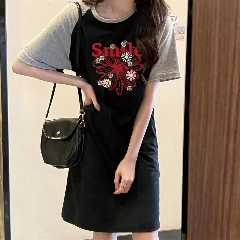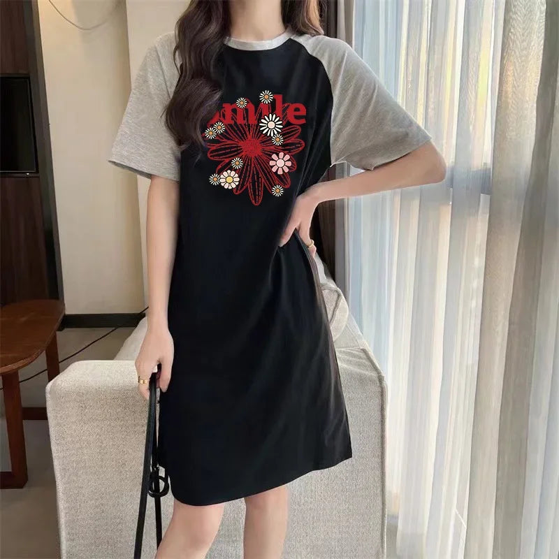 Summer American Fashion Trend: Simple Floral Print Loose Round-neck Short-sleeved Women's Dress