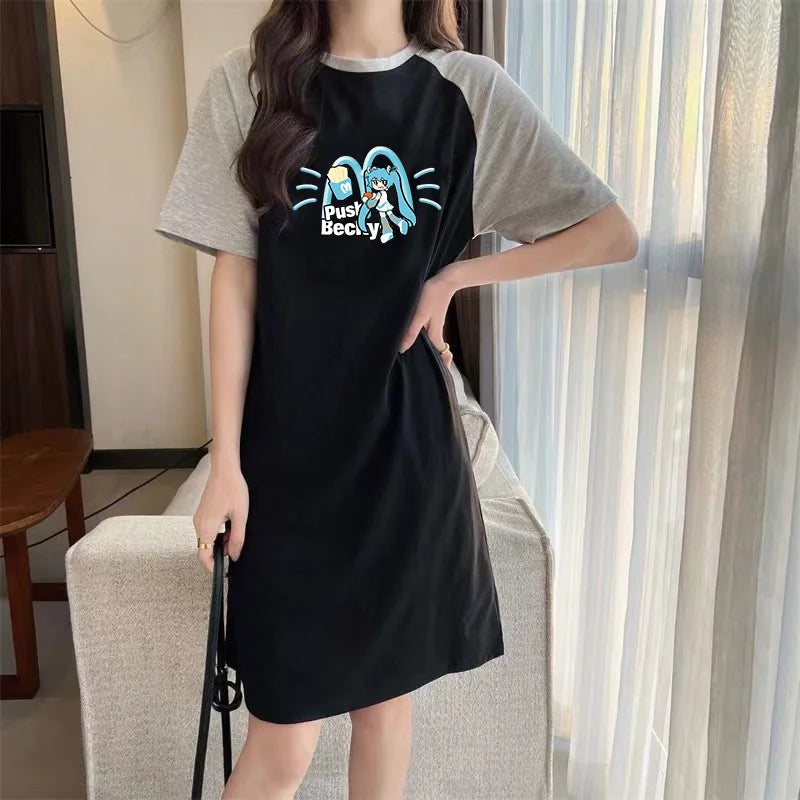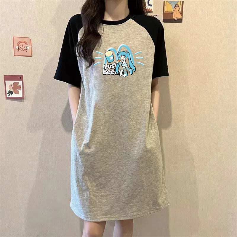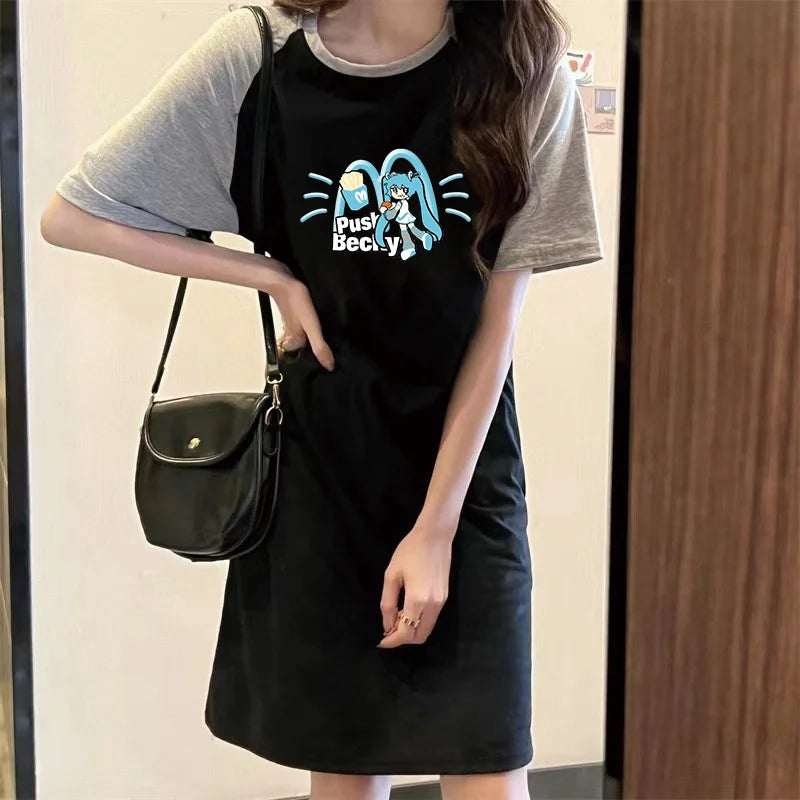 Summer Japanese Popular Cartoon Cute Girl Printed Loose Round Neck Short-sleeved Women's Dress